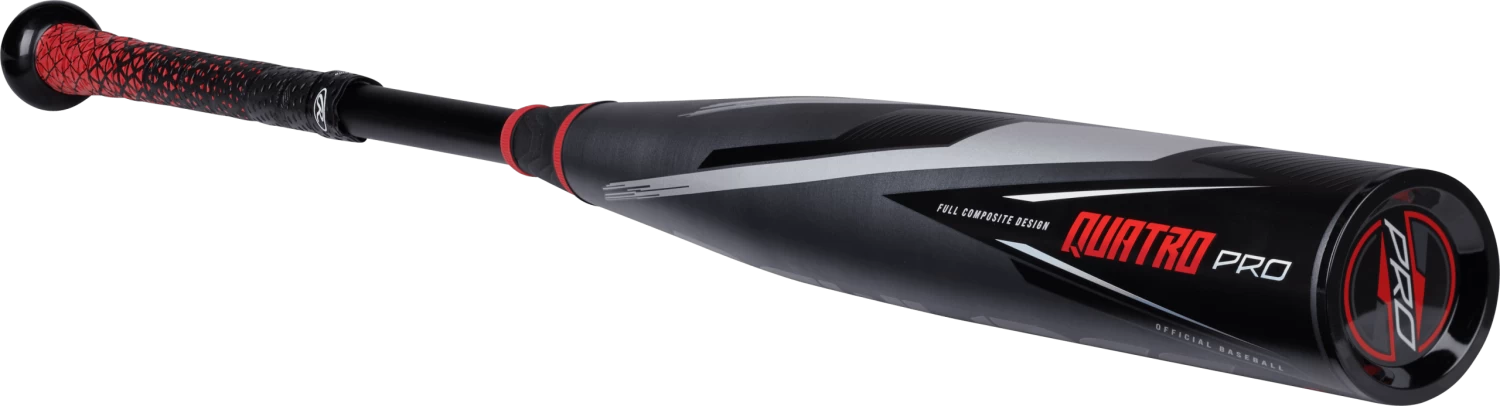 The New Rawlings Quatro Pro BBCOR Baseball Bat features a 2 5/8 inch barrel diameter, -3 length to weight ratio, balanced swing weighting, and is approved in High School and Collegiate Play.